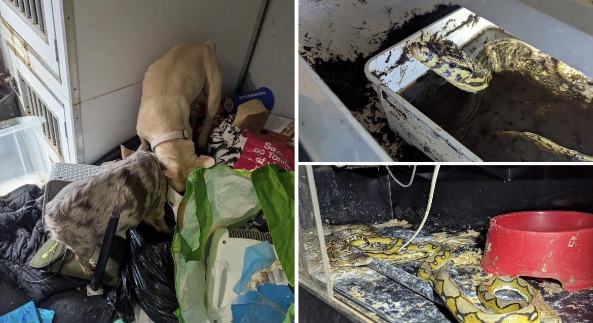 Tragically, two dogs and a snake were found dead at the scene. Vets later revealed the dogs endured shocking neglect — one with a ruptured rectum, another severely emaciated.